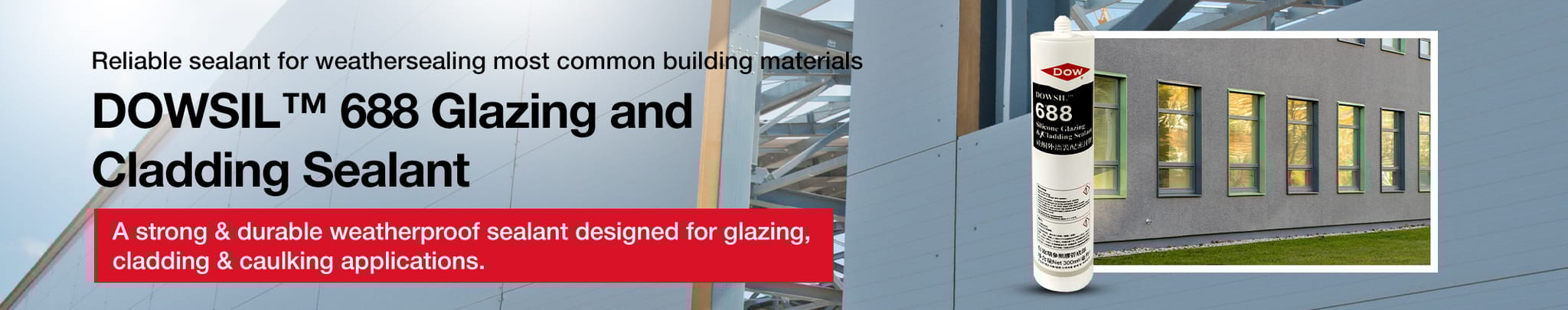 Applications: DOWSIL™ 688 Glazing and Cladding Sealant is designed for a wide range of glazing, weather sealing and professional caulking applications. It bonds to form a strong weatherproof seal on most common building materials.